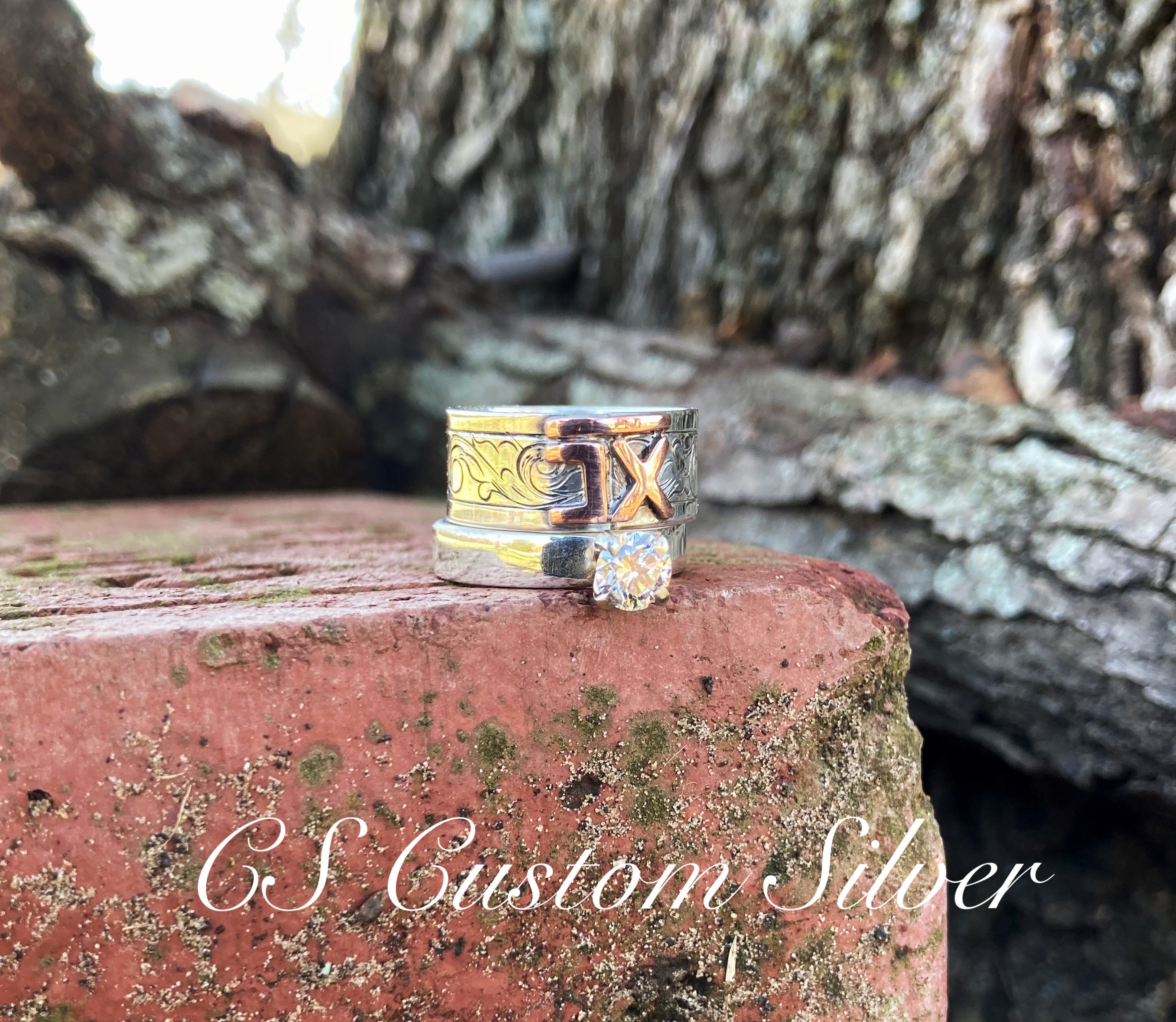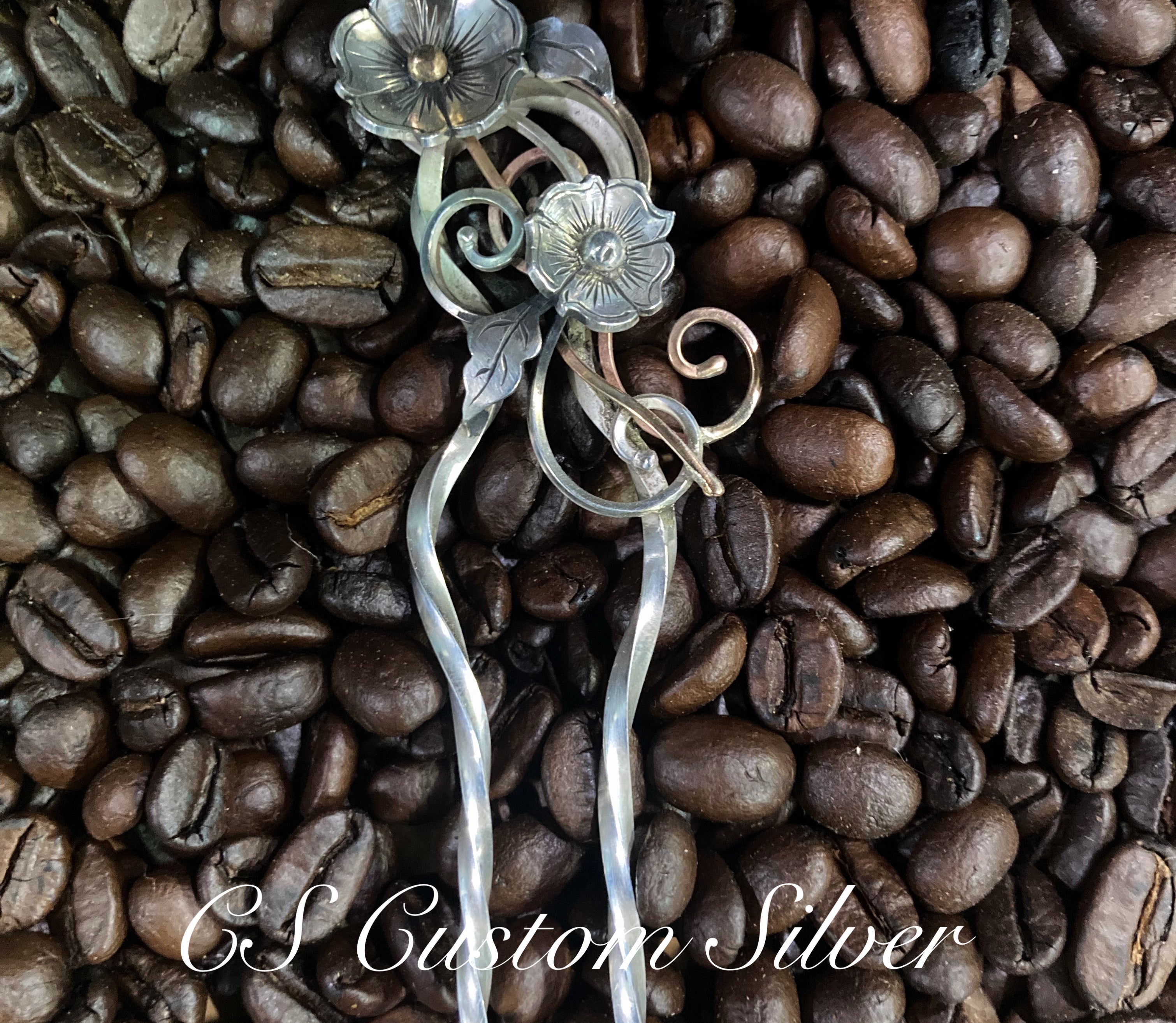 The Trendsetter is a solid sterling cuff with sterling overlay flowers. The vines and leaves are a striking combination of gold, rose gold, and sterling.