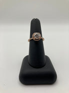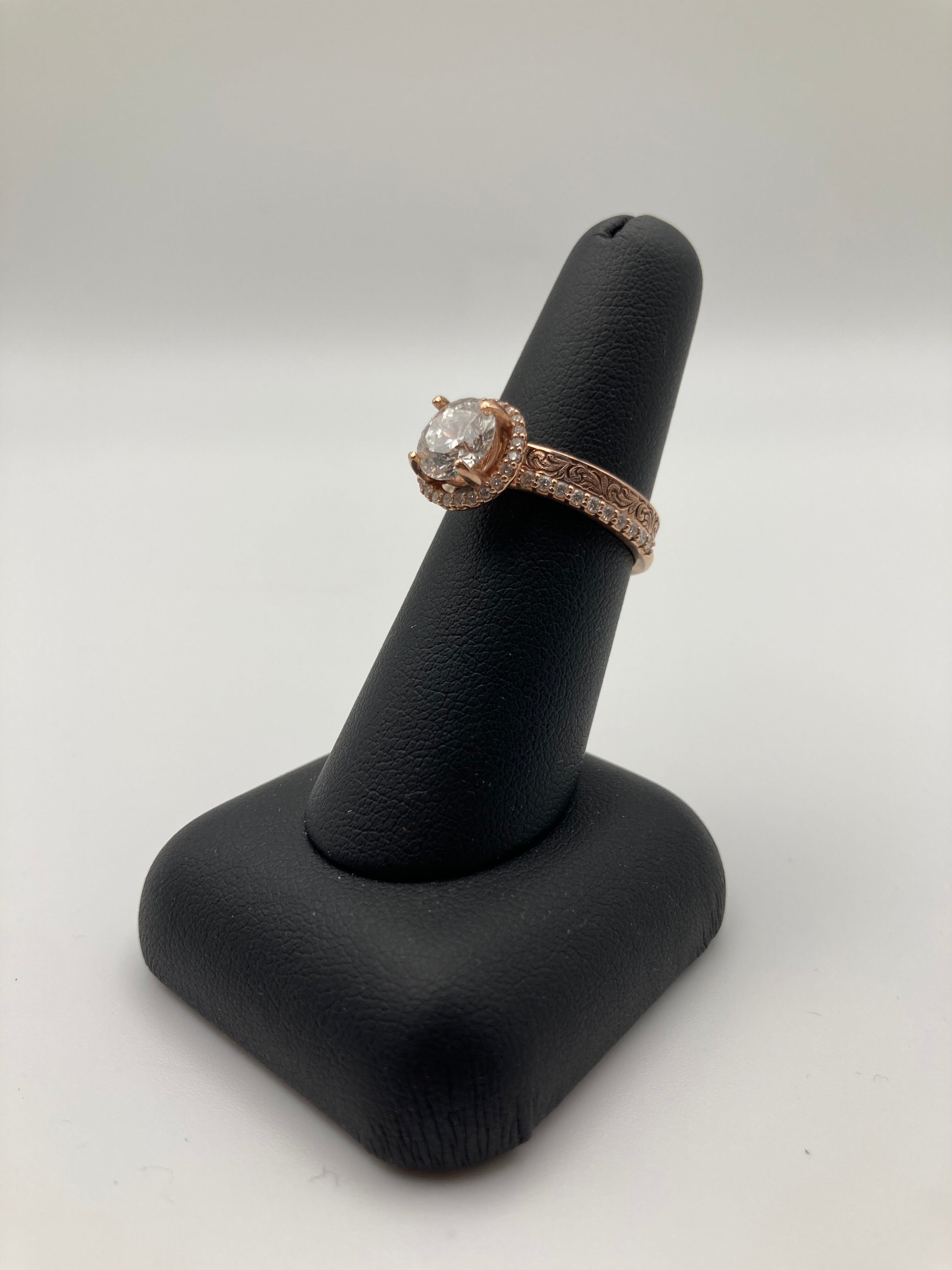 The center stone is a beautiful 1.5 Ct moissanite. Halo and band are adorned in diamonds. This timeless piece is fine western art.